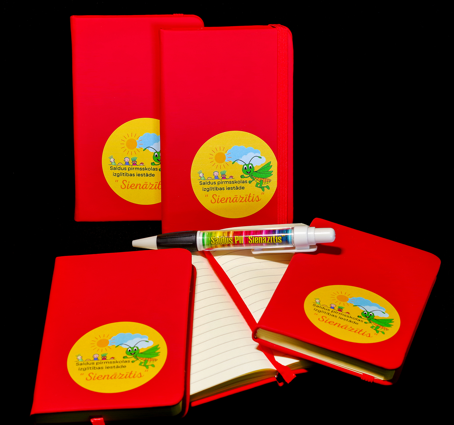 • Klades ar uzlīmi uz pirmā vāka![]() 1. Ar spirāli sastiprinātas 70 līniju lapas un kartona vāki, kam piestiprināta pildspalva un gumija vāku noturēšanai. 2. Cietajos vākos iesieta piezīmju grāmatiņa ar 96 līniju lapām. Pieskārienam patīkams vāka materiāls, lentīte kā grāmatzīme un gumija aizvēršanas fiksācijai. Cenas ar PVN par vienu blociņu atkarā no pasūtītā daudzuma: